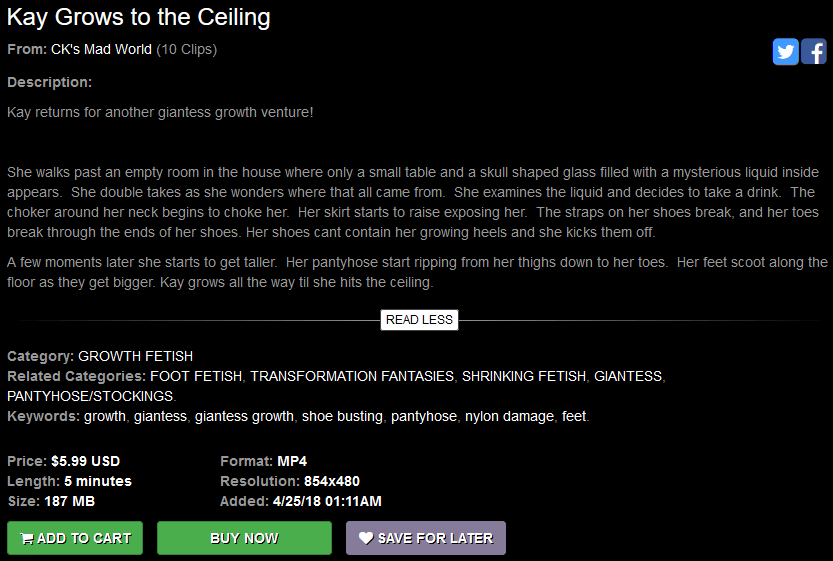 The intent of this blog is to cover a diverse range of creators, but it has yet to examine any videos produced by CK’s Mad World. Accordingly, when regular reader Johnny Cage asked, on July 31st of this year, for a review of “Kay Grows to the Ceiling” by CK’s Mad World it was a very appropriate request. (NOTE: CK’s Mad World has not released anything new in over a year. The most recent clip, Violet Nylon Foot Tease, was published on March 25th, 2019.) Therefore, let’s not delay any further and dig in!