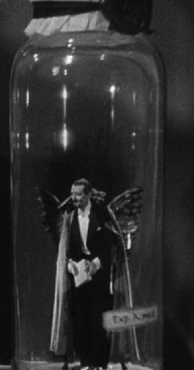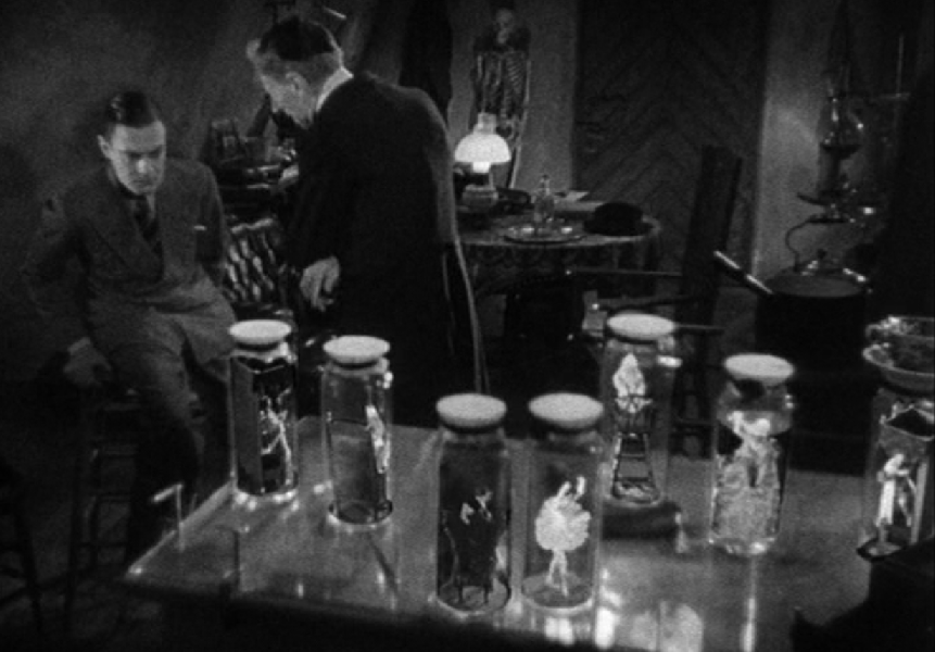 The sinister doctor demonstrates his own breakthrough by showing off a cabinet filled with bottles containing tiny artificial beings. Then Dr. Pretorius urges Henry to return to his experiments.