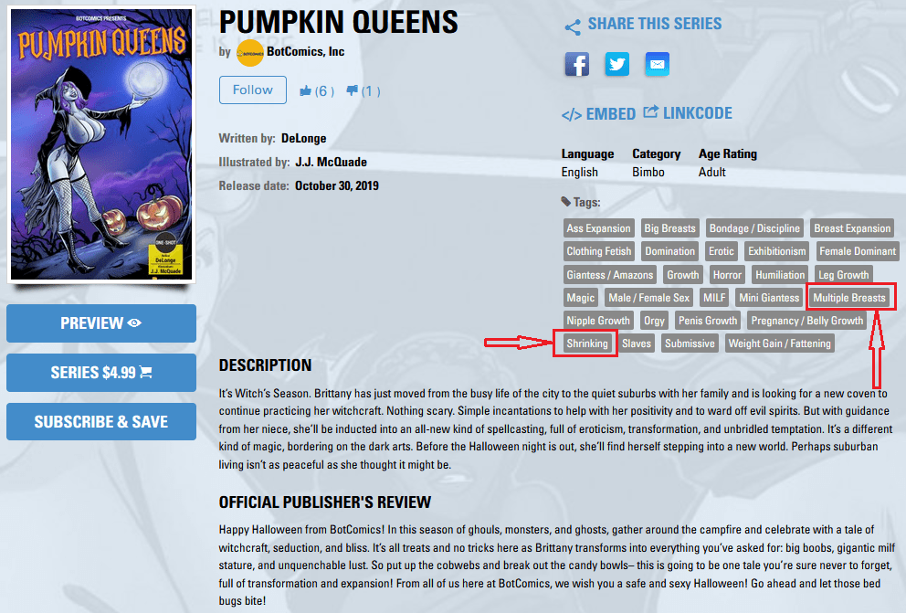 As a matter of fact, I did find four lovely ladies conducting a ritual during this most glorious time of the year. The magical hijinks amidst Jack-o’-lanterns was just what I was hoping to uncover. First, we shall discuss the tags used on the description page. For you see, this ritual was recorded on thirteen pages, including the cover, of a comic published by Giantess Club.