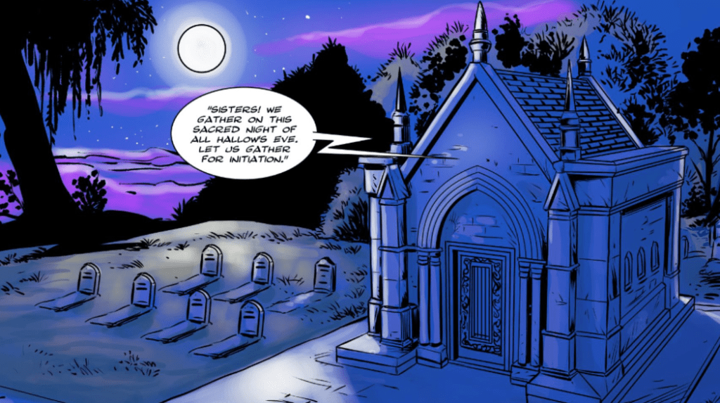 Next, let’s proceed by discussing the plot in general terms. It got rolling in a good place for a mystical ceremony, a spooky cemetery. However, the young spell-casters were improperly attired. One would expect thick wool robes, not bargain-bin costumes from Party City!