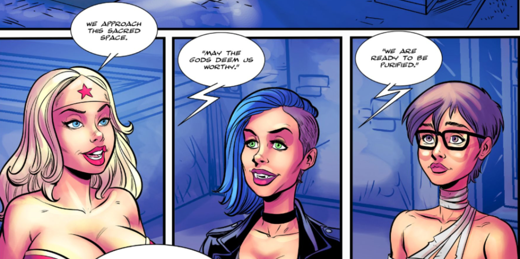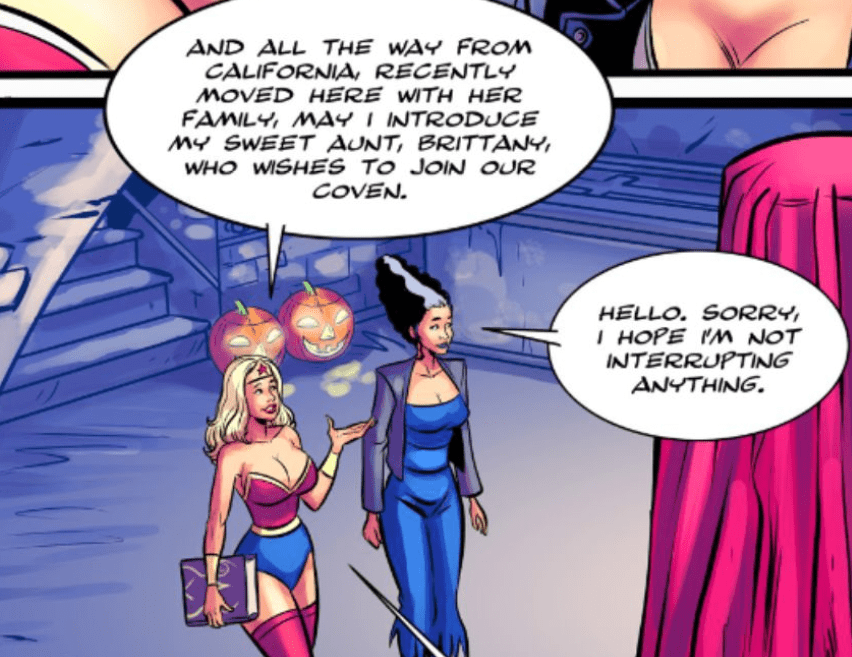 Readers learn that the three-women coven is meeting for a initiation. The blonde called this ceremony so her Aunt Brittany could join their group. The proceedings also involved four unnamed men who have their faces covered, but were otherwise completely naked. Allegedly, they were willing participants. Much breast expansion and sex is had and then the men merge with the stone pillar that they were bound to in order to create a giant dildo for Aunt Brittany. She had violently outgrown the crypt and required an extra-large masturbatory tool. (NOTE: The men presumably died in this process as they were never mentioned or seen again.)