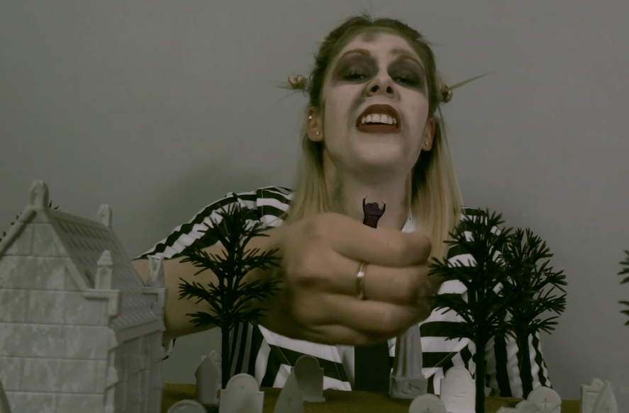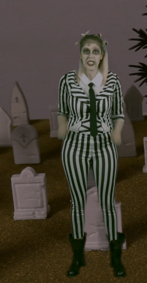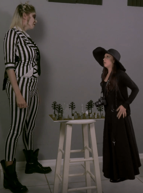 The plot begins with a photographer named Lydia taking pictures of a miniature diorama and noticing the diminutive Betelgeuse sitting on a gravestone. The charismatic phantom convinces Lydia to say his name three times and then grows from tiny proportions to human-sized dimensions. (NOTE: Initially, I had assumed that Nikki was playing a gender-swapped version of Betelgeuse. That is to say, I first thought that this Betelgeuse was a woman, but the actress talks as if she were playing a man. Betelgeuse even calls himself a man at one point; thus, I assume he/him pronouns are appropriate for the fictional character.)