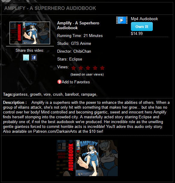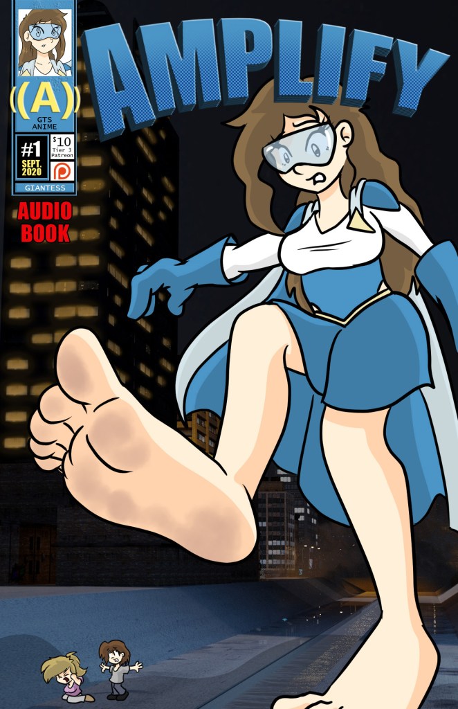 Amplify is a 21-minute long audiobook produced by Canadian Giantess. It’s a giantess superhero story named after the main character Amplify. Amplify is voiced by Eclipse, a performer who has been featured in many Canadian Giantess videos over the last two years. Additionally, Misty also provided some voice work, playing one of the villains. (NOTE: Misty voices Amanda in the animated “FantaSize” universe.)