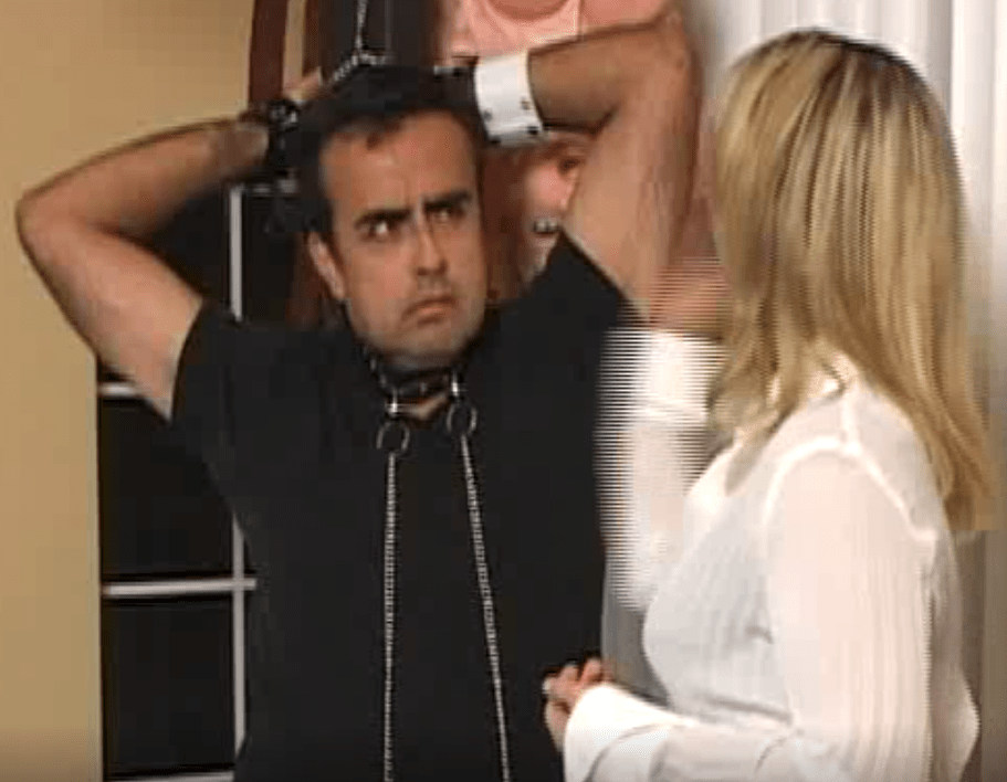 The narrative begins with That Guy to the Right! handcuffed and otherwise restrained while Kimberly slaps him. I could be wrong, but I don’t think this gentleman appeared in any other TMC productions. Kimberly’s blows are accompanied by comically overdone slapping noises. The sound effects were over-the-top, but I liked them. Kimberly apparently wants the guy to call himself an asshole, a loser, a moron, and other self-deprecating descriptors.