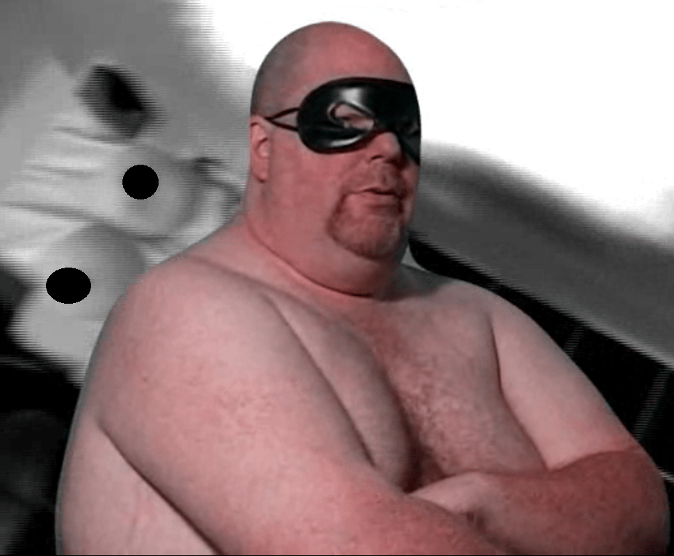 Eventually, he manages to free his right arm. Then he lunges half-heartedly while she steps back a bit and looks unconcerned. As this is happening, a fat man appears from nowhere in the middle of the room.