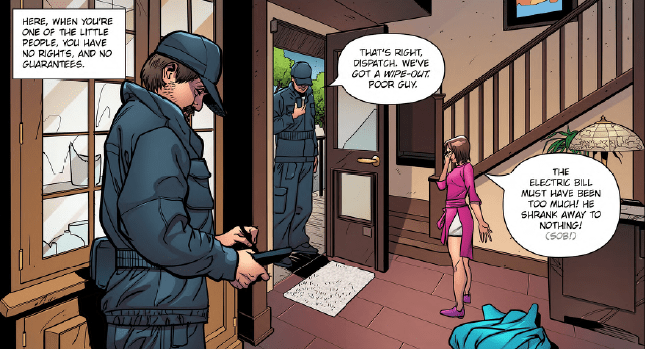 Focusing now on the comic itself, the easiest way to summarize Small Change is to note that it’s a size-themed take on the 2011 American sci-fi movie “In Time.” The unique element of In Time was the core idea that time (specifically a person’s remaining life span) was used as currency. If a person runs out of money then they literally die. Similarly, size is money in Small Change.