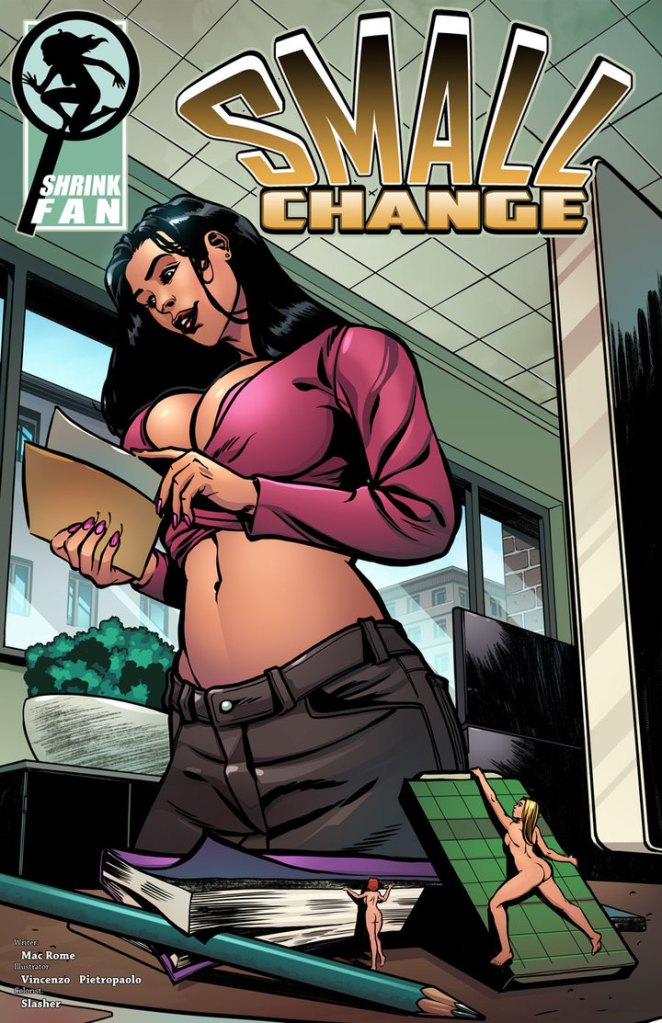 Mac Rome also wrote the fourth issue of Giantess Fan’s “Amazon Hotel,” all of “Bigger Than This,” and “Evita’s Big Night.” Vincenzo Pietropaolo’s only credit at Shrink Fan is for Small Change; however, Vincenzo also drew “Teacher’s Pet” for Giantess Fan.