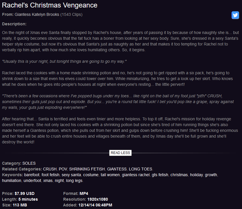 Overall, despite the lack of SFX, Rachel’s Christmas Vengeance should make a reasonably priced present for fans of tiny people being stepped upon by normal-sized women. It can be purchased for $7.99 here.