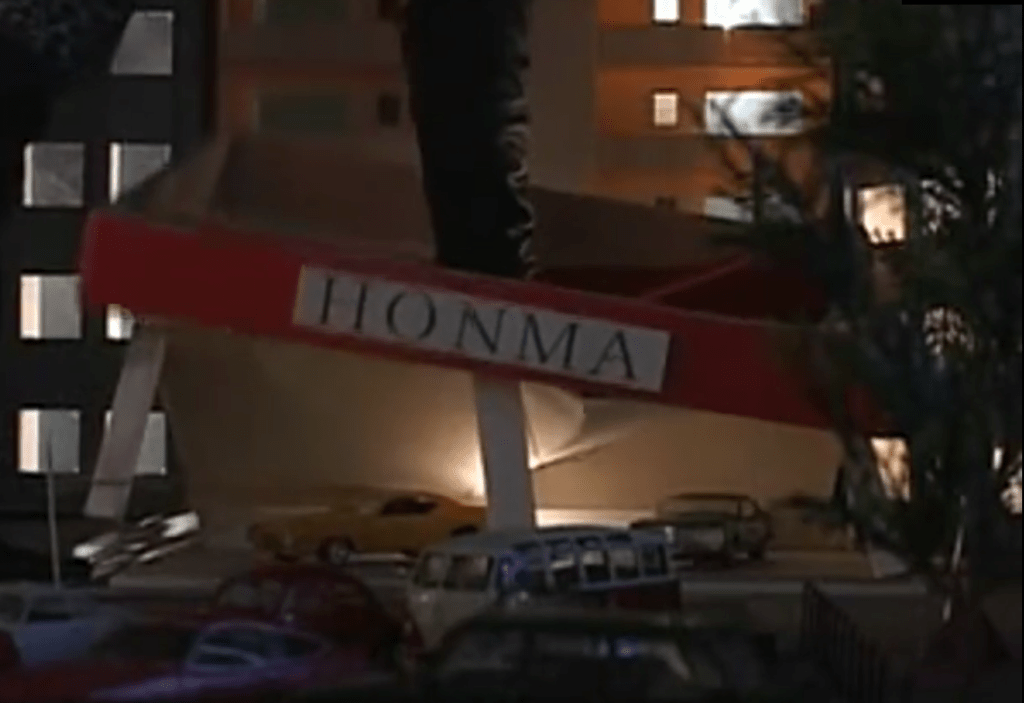 A “Honma” car dealership also falls prey to those pulverizing feet and it’s thoroughly flattened.