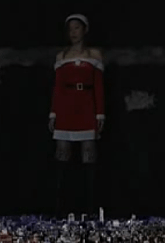 Be warned, the holiday-attired antagonist in “Huge Santa invasion” – 巨大サンタ襲来 is on a destructive rampage! (NOTE: Sadly, her motivation to destroy things or the method used to achieve her superhuman stature was never explained. For that matter, it would also have been interesting to learn who tailored her immense attire!) The 37-minute long video begins with the Santa giantess appearing in the suburbs of Chiba, Japan, at 9:30PM on Christmas Eve in the year 20XX (which looks a lot like Chiba in 2007) 😉