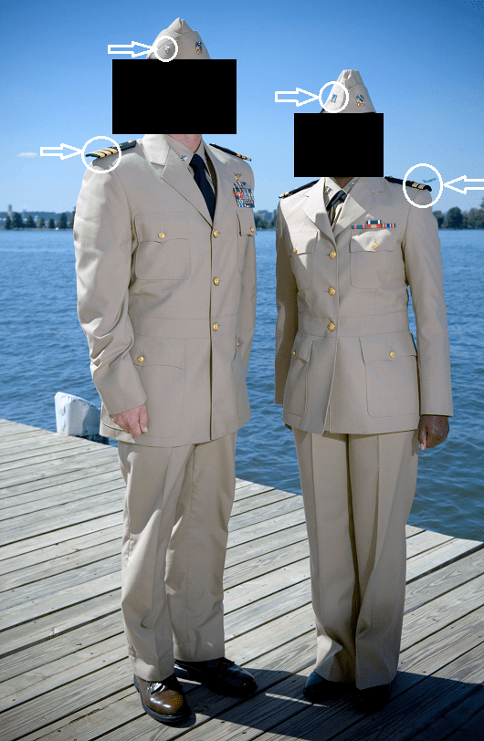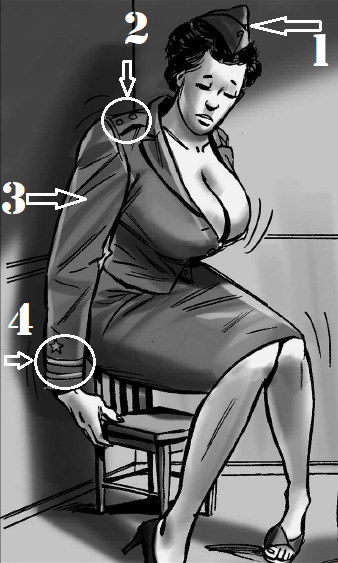 Also, she should not be wearing open-toed shoes and lastly she should be wearing a shirt under her service coat. (NOTE: Although, given the lovely lady’s generous bosom, I can appreciate the decision to omit a breast-covering dress shirt.)