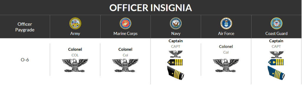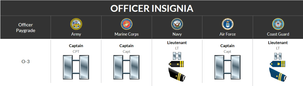 Additionally, the rank of “Captain” equates to officer pay grade O-3 in the Air Force, Army, and Marines, but equates to pay grade O-6 in the Coast Guard and Navy.