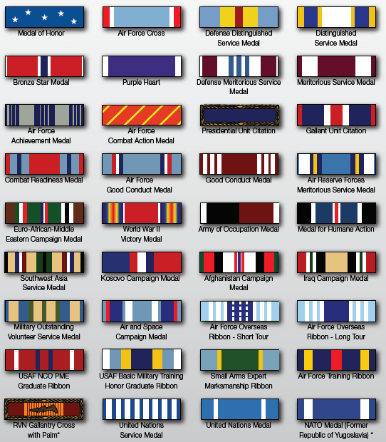 Notably, we haven’t delved into awards and decorations or badges. They tell the history of a person’s achievements and experiences. For example, the following are some of the awards and decorations which can be worn by Airmen. (NOTE: These are the ribbon forms, not the medals.)