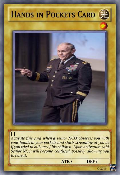 Before we get started though, let me make two things clear. First, I have no interest in hearing that someone’s brother is in the Navy and grew his hair out while on leave. Similarly, if your cousin’s wife’s friend is in the Army and regularly puts his hands in his pocket while in uniform and out in public, I don’t give a fuck. People are people, even in the military, and they break the rules sometimes. Especially if there aren’t any zealous NCOs nearby.