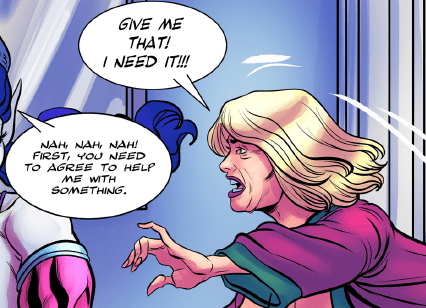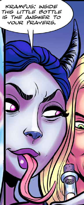 The BotComics trend of ensuring that characters are related continues in this publication. Krampus states that she is Santa’s older step sister. That adds nothing of value, but does raise more questions which will never be answered.