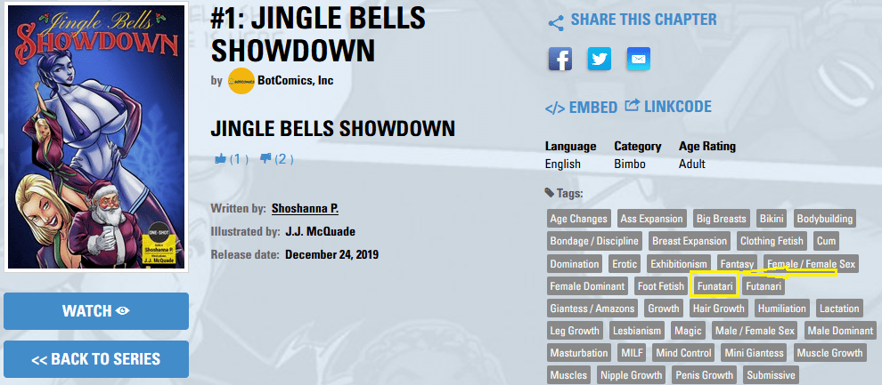 Before worrying about next year, let’s examine another Christmas-themed creation. We’ll look at Giantess Club’s “Jingle Bells Showdown,” authored by Shoshanna P. and illustrated by J. J. McQuade. Shoshanna P. also wrote “Breast Expansion Online: #BigMama99,” “Cruise Controlled: Flipped Over,” and “Growth Studies: Penelope Estrada.” J. J. McQuade has drawn a ton of issues for BotComics, the parent company for Giantess Club. McQuade’s art was used in “Hunting for Bigfoot,” “Loving Cupid,” “Mrs. Turner,” etc.