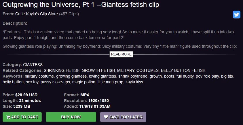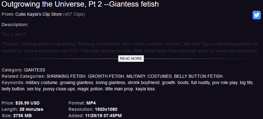 This review will cover two clips entitled “Outgrowing the Universe,” which were made by Cutie Kayla, a.k.a. Kayla Kiss. Kayla, a Midwest girl from the U.S., has produced fetish videos for over 9 years. The first was “Lotion, Candy, and Feet!” which was published on June 20th, 2011, at Clips4Sale. Since then, she has produced several works centered on size themes such as “Giantess ASSassination!”, “The Little Navy Men,” and “The Loving Giantess.”
