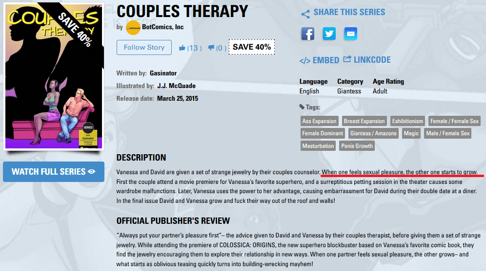 Returning to Couples Therapy, the story involves a bickering young couple, David and Vanessa, who were each given special gifts, a bracelet for him and a choker for her, to heal their strained relationship from the marriage counselor Dr. Goldman. The description on the Giantess Club site states that the jewelry makes it so that “When one feels sexual pleasure, the other one starts to grow…” However, the actual text within the story itself describes the jewelry a bit differently, stating instead that they were reminders to always put their partner’s pleasure first.
