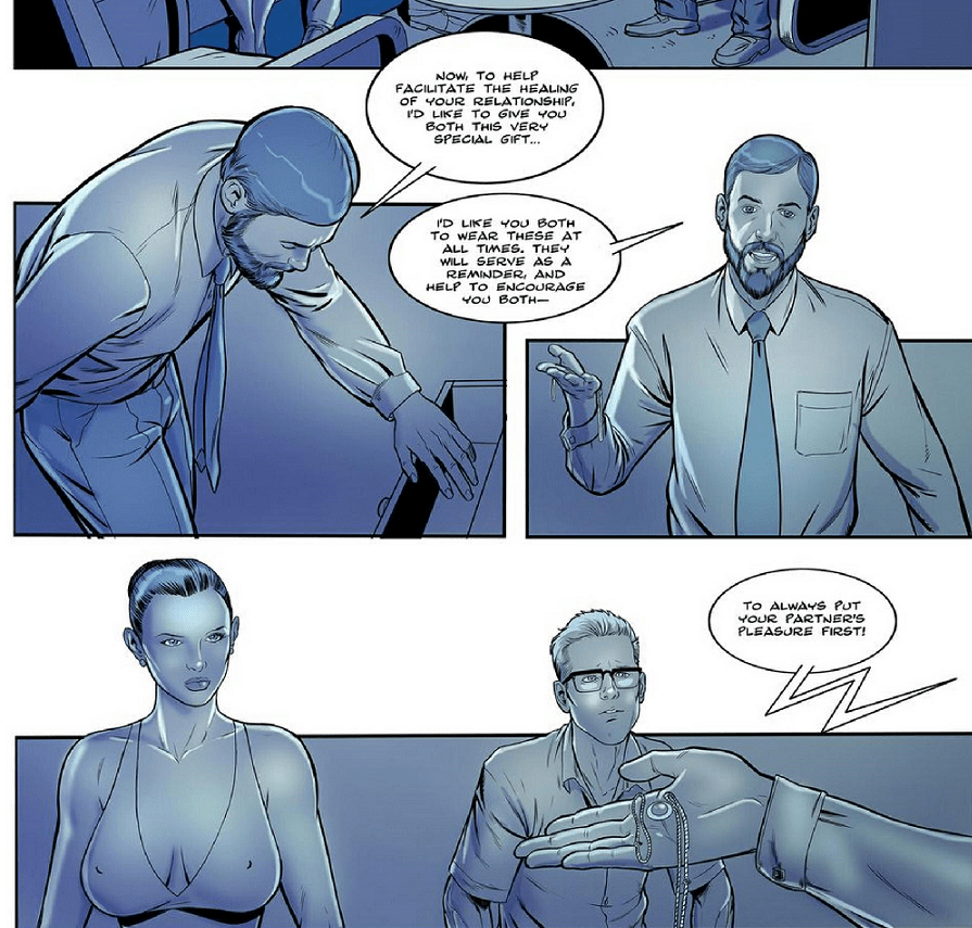 Based on the idea given in the comic, that the jewelry pieces were reminders to always put the partner’s pleasure first, I was surprised that everything appeared to be driven by Vanessa’s wants. She is the one who loves the idea of growing. Conversely, it wasn’t noted what David wanted. David was a blank slate and seemingly his only purpose was to listen to Vanessa complain. (NOTE: Although, towards the end he did enjoy growing and of course sex with his giant wife.)