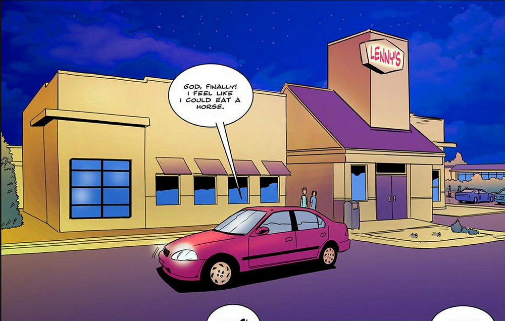 Also, there was an instance in which dialogue bubbles were misplaced. The following panel takes place after David’s penis had become visibly erect, and rather large, while sitting in a movie theater. Vanessa notices and comments accordingly. However, the question “What’s got you so worked up?” was attributed to David, not Vanessa. I’m certain that the question was supposed to come from Vanessa, because she had noticed his erection, and not from David himself.