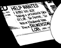 The professor determines that his plan to expand a person to the size of four light years may be dangerous so he placed an ad in the newspaper seeking someone who is single with no family and “taking a pessimistic view of life” ergo hopeless. (NOTE: In reality, a newspaper might think twice about running classified ads seeking “hopeless” people as that sounds like a recipe for disaster!) Presumably, the professor’s rationale was that such a person would be willing to take a deadly risk for the sake of the experiment. (NOTE: Or at the very least since they have no family no one would demand that the legal authorities prosecute Professor Skelmersdale if things go awry!)