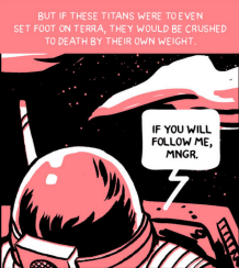 All of this is to say that I don’t believe Titans would be super powerful like they are shown as in this graphic novel. For instance, a Titan easily crushes a human’s skull with one hand in the following panel.