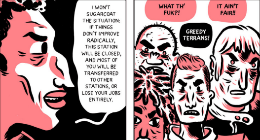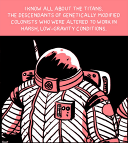 Setting that aside, this graphic novel raised other interesting questions and failed to address or answer most of them. For example, there was talk of Titans potentially losing their employment which caused me to wonder what would that mean, exactly? Do unemployed Titans go on welfare? Or does joblessness mean death, because the people in charge kick those people out an airlock when they can’t pay rent? What is social welfare like on a world run by a corporation? (NOTE: Probably really shitty if not wholly non-existent!) At least on Earth homeless people won’t die immediately in the outdoors, but it was already established that Titans could not go to Earth without perishing. However, it was never said what unemployment truly entailed for a Titan.