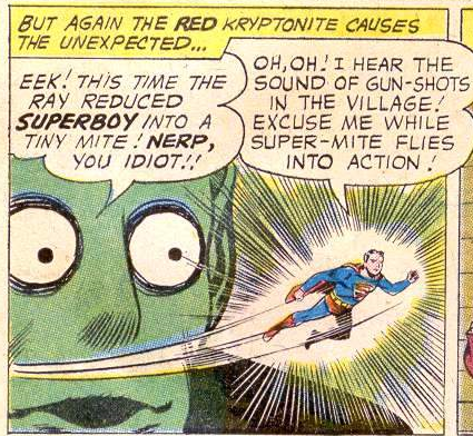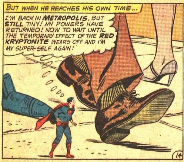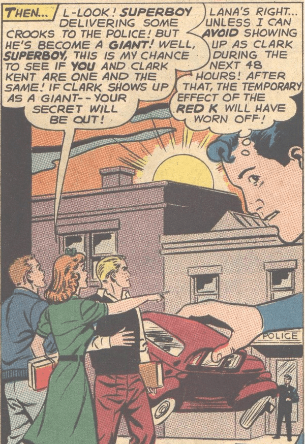 Like Kandor, red kryptonite also first appeared in 1958. Instead of killing Kryptonians like green kryptonite could, red kryptonite produced random, but temporary effects. That made for fun stories, but red kryptonite became a crutch for the writers and was used too frequently. For example, how to explain Superboy shrinking? Red kryptonite! How to explain Supergirl fighting a double of herself? Red kryptonite! How to explain Superman turning tiny? Red kryptonite! How to explain Superboy turning giant? Fluoride in the drinking water! Err, I meant red kryptonite! Or “Red K” as us cool kids call it 😎