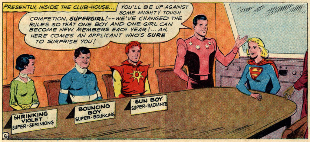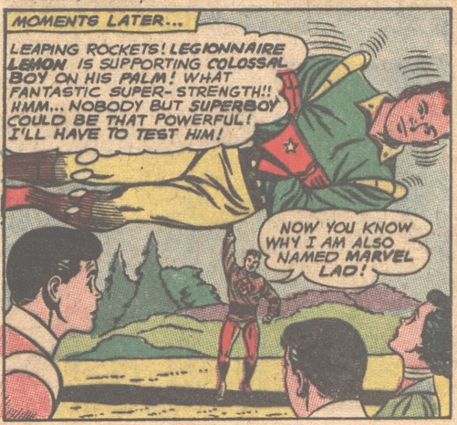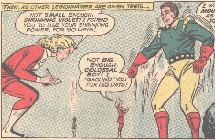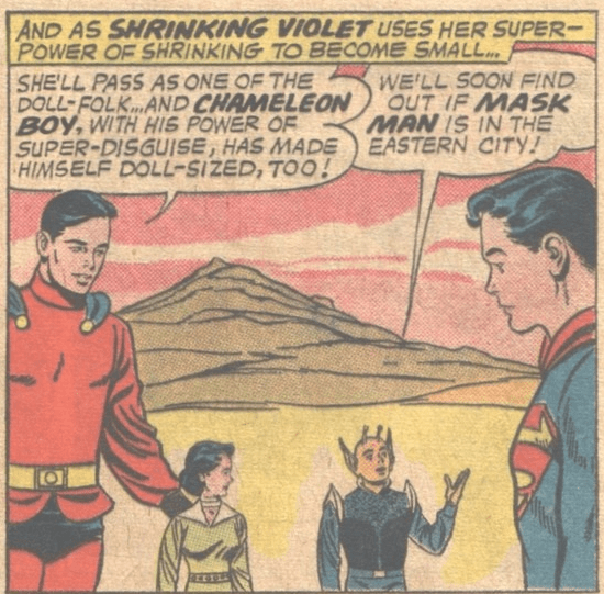 Special mention should also be given to Chameleon Boy whose gimmick was shape changing. This ability included becoming doll-sized which allowed him to accompany Shrinking Violet into a town of tiny people: