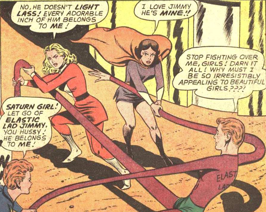 Jimmy’s most frequent transformation was into a super hero called Elastic Lad with powers temporarily granted by drinking a special liquid. Alas, this had drawbacks: