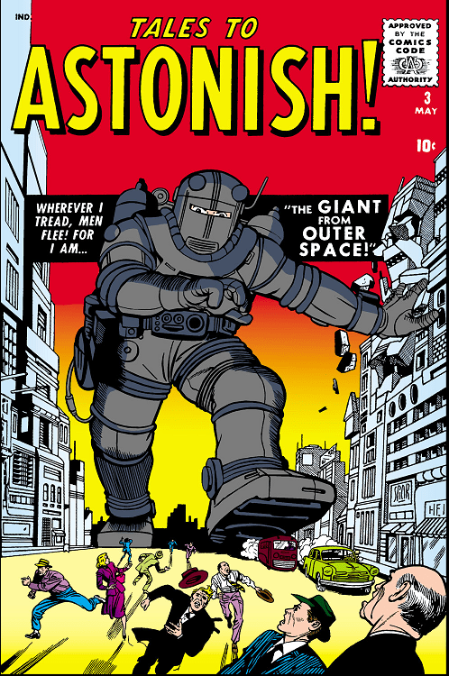 Marvel shifted from super heroes to science fiction and supernatural tales during the later half of the Golden Age. This trend persisted during the first part of the Silver Age with one-off stories such as “I am the Giant from Outer Space!” in the anthology series Tales to Astonish #3 from May 1959.