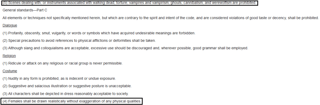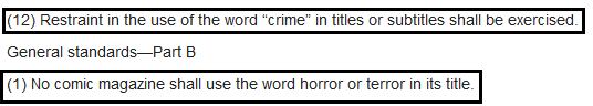 The Comics Code killed EC Comics and many of its provisions may have been written with that very intent in mind! For example, the code restricted titles which included “Horror,” “Terror,” or “Crime.” It just so happened that EC Comics published “The Vault of Horror,” “The Crypt of Terror” later renamed “Tales from the Crypt,” and “Crime SuspenStories.”