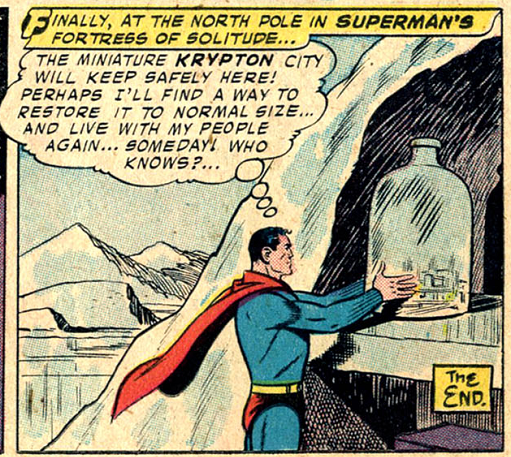 Brainiac shrunk metropolis like New York and Paris and placed them within bottles on his space ship, but Superman was eventually able to restore them. While exploring Brainiac’s vessel Superman also discovered Kandor, a city taken from Krypton before it exploded! However, before Superman can use the last remaining enlarging charge to restore Kandor, a Kandorian scientist (conveniently a former college roommate of Superman’s Kryptonian father 😉 ) used that final charge to return Superman to normal. Since then, the city of Kandor has (mostly) remained small.