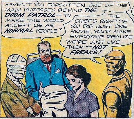 During their first appearance the Doom Patrol members were described as “… four outcasts of the world …” Later issues called them “freaks” and “misfits.” This set them apart from other super-heroes since their powers were not just bonuses, but also minuses. They were granted extraordinary abilities due to strange accidents, but they also suffered. Chief lost the use of his legs. Negative Man was covered with bandages and ostracized by others. Robotman was similarly isolated due to his mechanical body. However, the label “misfit” was a misnomer for Rita Farr. The Chief, Negative Man, and Robotman were unable to hide their afflictions. Conversely, after the initial onset of her morphing ability, Rita had full control of her powers. She would not grow or shrink unless she chose to do so. Or if a super-villain invented weird gas to make her body compress itself against her will. Baring that last, Rita had complete control. So, she could simply live out her life and no one would know of her unique nature. Negative Man and Robotman were not so lucky!