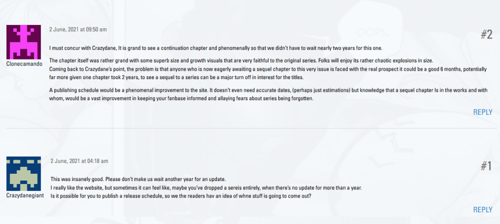 Overall, the best way to improve this series (and moreover enhance the entire site) would be to release a publishing schedule. I would love it if ongoing comics were released on a monthly basis. However, that is not the current process. Instead, there are no indications when issues will be released.