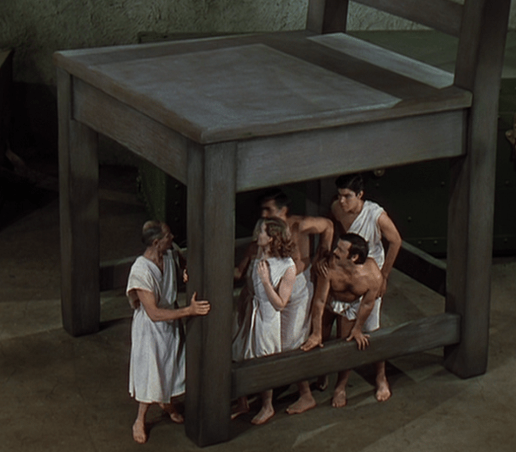 In general, the biggest selling point is the special effects work. An extensive number of oversized props were used. The production crew duplicated the doctor’s quarters to a high degree of accuracy and recreated normal-sized objects in giant scale to sell the illusion that the actors had become tiny. These efforts worked well. A giant chair, seen below, was accompanied by extra-large books, a knife, a pencil, pin, scissors, etc. I was pleasantly surprised at how much effort was put into the practical effects.