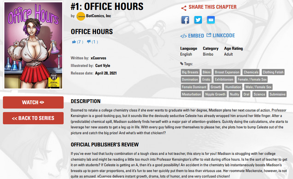 Accordingly, let’s discuss “Office Hours.” This is an ongoing breast expansion (B.E.) series, with only a single issue so far, which was first released on April 28th, 2021. It was drawn by Curt Vyle and written by xCuervos. Curt Vyle made his debut in January of this year drawing “The Amazing Fultra.” In contrast, xCuervos has worked for BotComics for many years beginning with 2017’s “Rent Money” and continuing with several other BESC and Giantess Club series to include resurrecting the long-dormant “Ascension.”