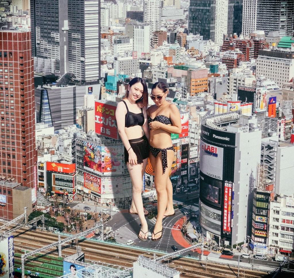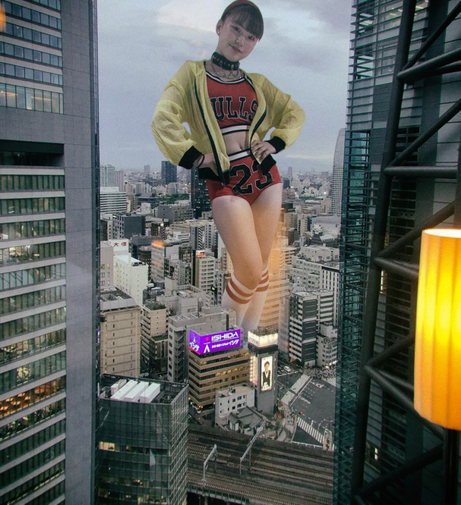The prevailing theme in my collages has been the depiction of an alternate universe where giant women are a totally normal phenomenon. This is largely informed by my love of mainstream content like commercials and music videos where the normal-sized people below are indifferent to the presence of giants among them (for example, again, the “Love is Strong” music video or the “Tokyo Gigantic Girls” art project). For the most part, the giants are just going about their own lives in coexistence with the small world around them. I have recently started writing some short stories and news articles to expand on this idea; I try to consider how a particular girl would act if she were normal-sized, and then adapt that behavior to her giant-sized self without changing much. Therefore the women in my work are typically not malicious or violent, though they are sometimes unaware or indifferent to the consequences of their size, so there’s a lot of unintentional destruction of property and such. Another motif is the idea that giant women are aware of the minutiae of normal-sized life (such as enjoying air conditioning or taking the bus) but, because of their size, haven’t experienced it themselves, and that leads to curiosity and sometimes demonstrable ineptness.