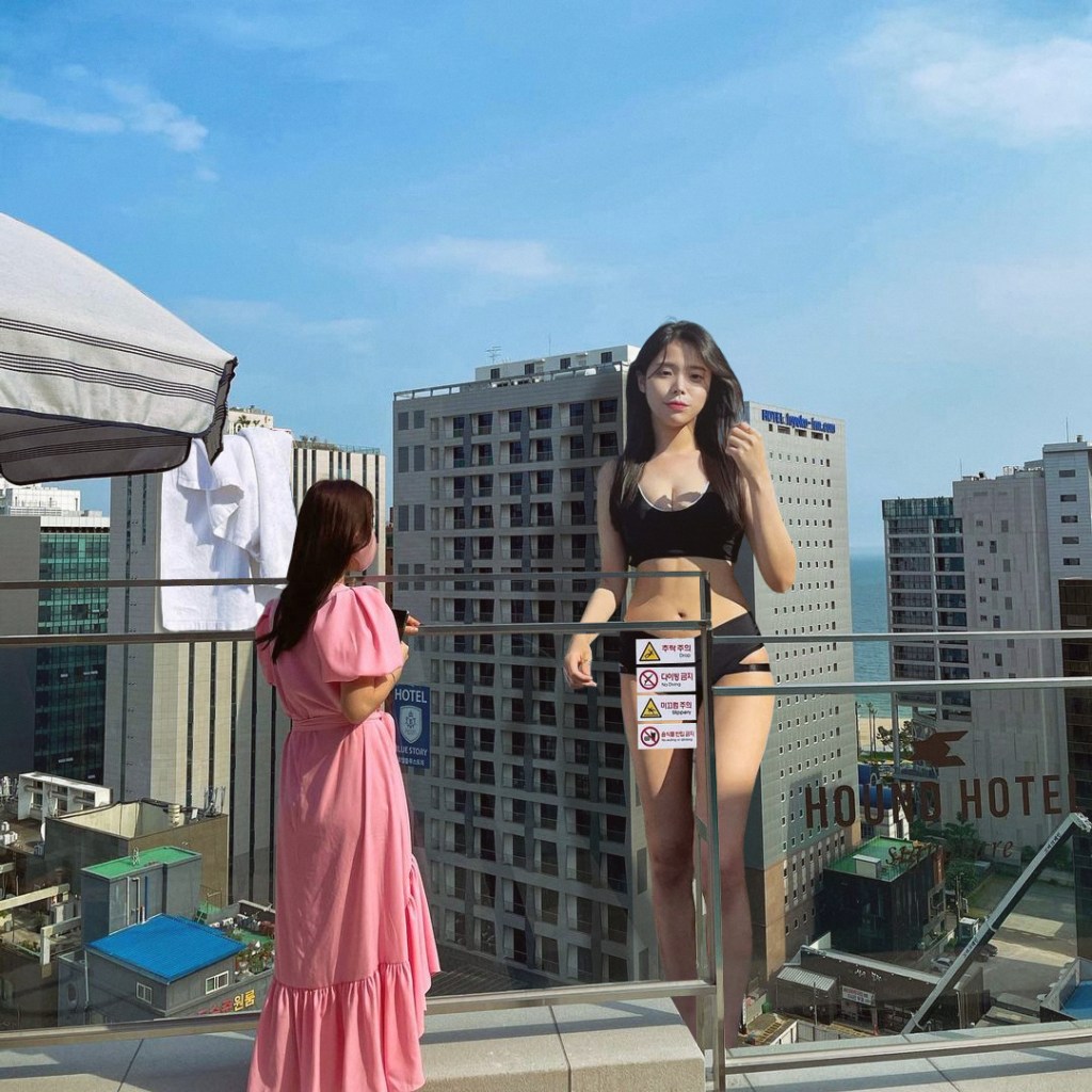 ReverseOthello, a.k.a. Kyojingirls, is a talented artist who has modified numerous cityscape photographs to add beautiful giant-sized ladies into those urban settings. These images typically feature giantesses in large East Asian cities such as Seoul, South Korea, and Tokyo, Japan. The ladies are attired in revealing clothing such as swimwear or tight shorts and tiny tops, but never fully nude. Instead, ReverseOthello’s works most often portray bikini models the size of skyscrapers in suggestive posts that don’t become too explicit. Many of these altered photos also have short stories to provide more context. Fans can find ReverseOthello’s art at the General Sizefetish uploader and on Twitter.