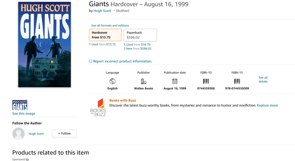 Today, we’ll do something different and examine a short book called “Giants.” (SIDE NOTE: The last book we reviewed was “Enormity” by W. G. Marshall.) Giants is a young adult (YA) novel which was first released in mid-August 1999 and was created by Hugh Scott, a former art teacher turned writer.