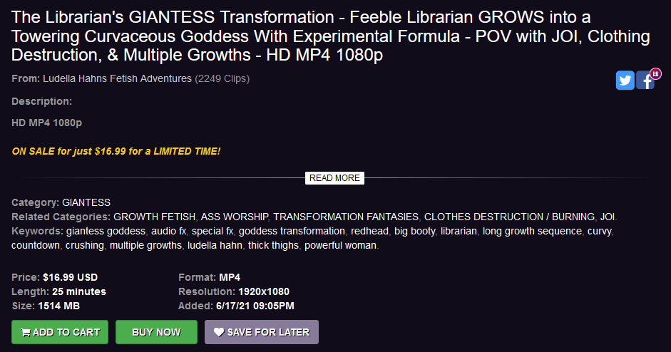 That noted, I think most size fans will appreciate this video. The Librarian’s GIANTESS Transformation can be purchased for $16.99 at the following link: https://www.clips4sale.com/studio/36032/25100283/the-librarians-giantess-transformation-feeble-librarian-grows-into-a-towering-curvaceous-goddess-with-experimental-formula-pov-with-joi-clothing-destruction-multiple-growths-hd-mp4-1080p