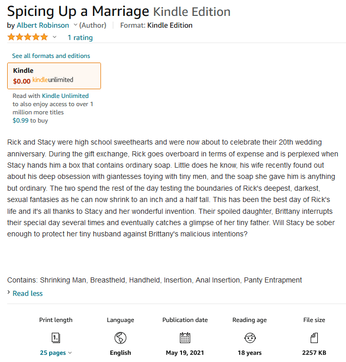 Nonetheless, I recommend Spicing Up A Marriage to lovers of tiny men with cruel women. (NOTE: Some may classify this as a “cruel giantess tale,” but I prefer to use “giantess” only when women are supernaturally tall, not when men are tiny.) The multiple explicit scenes between tiny Rick and comparably enormous Stacy should strike a chord with many fans. It is available at a very reasonable price, 99 cents, and can be read for free by Amazon customers paying for Kindle Unlimited. Interested readers can find it here: https://www.amazon.com/Spicing-Up-Marriage-Albert-Robinson-ebook/dp/B095J2X5S6/