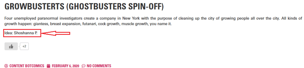 Overall, Growbusters was fun and should appeal to breast expansion fans, but it would have benefited by incorporating conflict. Obviously, BotComics is a place showcasing size fetish, and thus perhaps not the place for a comic with page after page of the characters battling monsters who cause gruesome injuries and pain, like in a gritty horror film. However, some light conflict would have made me care about what the ladies were doing. To give just one example, make it so the ghosts rob people of sex drive and if they aren’t defeated in 24 hours then everyone in New York City will lose all desire to have sex. Thus, the growbusters have to fuck the ghosts and save sex in New York City! Basically, a proper goal, with obstacles to overcome and a timeline, would have been great.