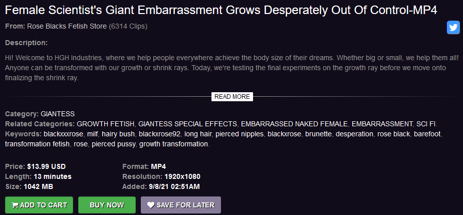 Female Scientist’s Giant Embarrassment Grows Desperately Out Of Control wasn’t a bad growth video and Rose comes across as a charismatic performer willing to perform fully nude and eager to appear in size fetish scenarios. That’s great! Nonetheless, the lack of special effects beyond green screen and the lack of clothing destruction will likely deter most growth fans. Those size fans still interested can purchase this for $13.99 at the following link: https://www.clips4sale.com/studio/54271/25432787/female-scientists-giant-embarrassment-grows-desperately-out-of-control-mp4