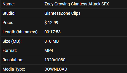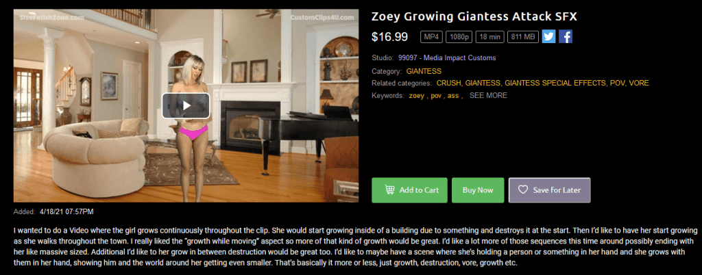 Today, we’re returning to the plethora of videos producing by Media Impact Productions. This post will examine “Zoey Growing Giantess Attack SFX,” an 18-minute clip released on April 18th, 2021, from Giantess Zone (one of Media Impact’s many brands). This clip was commissioned via the following request: