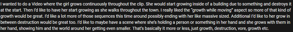Regarding the initial request that the “… girl grows continuously,” that wasn’t really achieved. It was more like a series of separate and distinct growth spurts as opposed to Zoey steadily and gradually enlarging overtime. Long-time giantess fans have already seen many, many clips in which a clothed performer experiences a few growth spurts, swallows people, and then the clip abruptly ends.