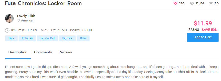 On that topic of supporting creators by buying fetish media, Lovely Lilith’s Futa Chronicles Locker Room is a recommended purchase for futanari fans. It has an actual plot driving the action and an attractive buxom star who pays a lot of attention to her naturally huge breasts and her admittedly less natural cock. It can be found here: https://www.manyvids.com/Video/2814946/Futa-Chronicles-Locker-Room/