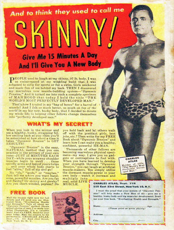 Adults reading physical comic books in their office seemed a little odd. Not that it was a crucial point, and of course it’s not impossible by any means. Still, even in the 1980s when this story was first released, it felt like an anachronism or a relic of an earlier time. No actual timeframe was given for the story, but it feels like this was set in the 1940s or 1950s. That was further reinforced when a reference was made to a “Charlotte Atlas” pamphlet, parodying the Charles Atlas ads which used to run in comic books. Ads like this one: