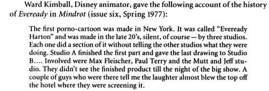 Reportedly, this was the first “porno-cartoon,” as noted in the animation fan magazine Mindrot in it’s sixth issue from Spring 1977:
