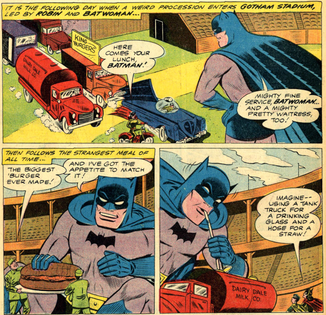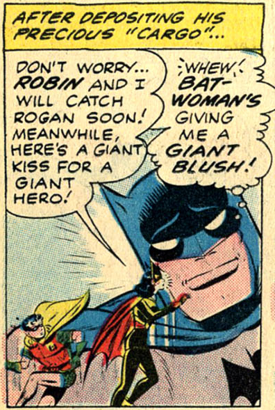 Turning to the plot of Detective Comics No. 292, the growth agent was introduced in a rather random fashion. Batman chases Rockets Rogan and his gang, they ride in a rocket-car by-the-by, who flee into a “great laboratory.” In that lab, Rockets Rogan, the leader of the gang, overturns a table full of upper atmosphere samples which swiftly enlarge the world’s greatest detective.